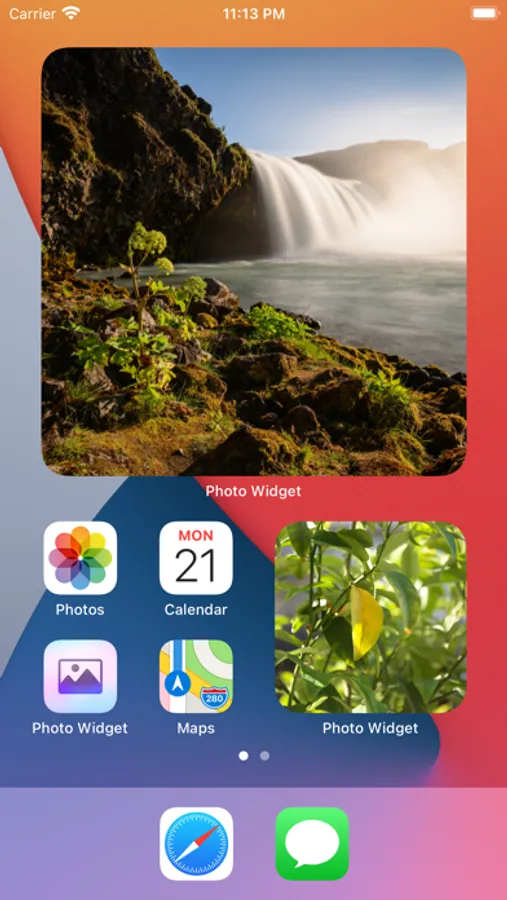 Create as many photo widgets as you like with one or more photos per widget. If you choose more than one photo, it will change photos on a time interval (which can be customized in the settings). Each widget can have separate photos. You can also show photos from an album in your photo library.