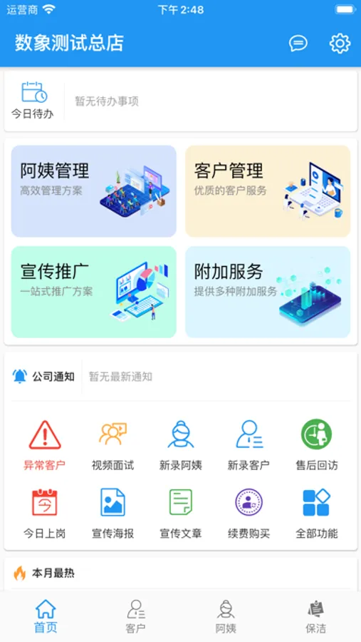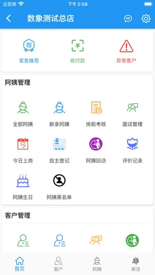 主要功能包含客户管理、阿姨管理、视频面试、家政微网站、阿姨证书、家政培训、财务管理、门店管理、风险管理、移动办公等。