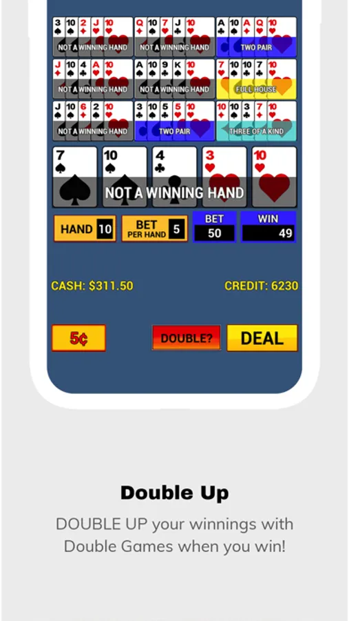 Begin with 60000 credits and use the on-screen buttons to place your bet. Then, just press ‘DEAL’ to get 5 cards! Before 'DRAW' new cards, you have the opportunity to hold some of the cards in your hand or not. See what you can win from the pay-table. Video Poker Multi is fun, addictive, and free-to-play!