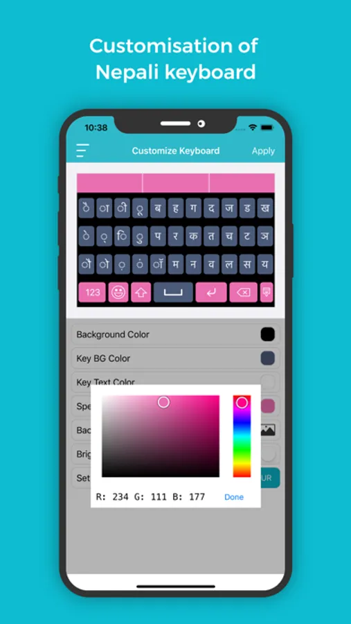 • Change colors for the Background colour, Key background colour, Keyboard text colour, Suggestion box colour etc, so that typing does not seem boring and monotonous with this Nepali keyboard for iOS.