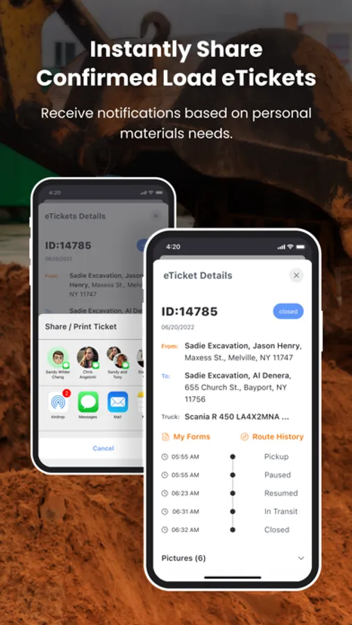 Companies will want to use this service instead of using paper tickets for the moving of dirt, aggregates and other materials from one location form/to their jobsite. Admins can create tickets, schedule drivers, and get invoices done faster. Drivers are able to take pictures of the materials at pick up and delivery, request eSignatures and share completed tickets.