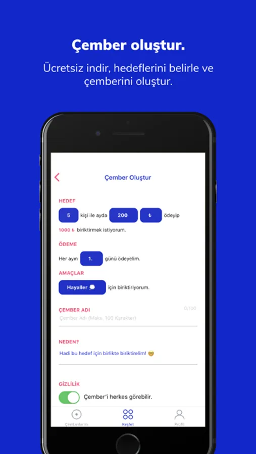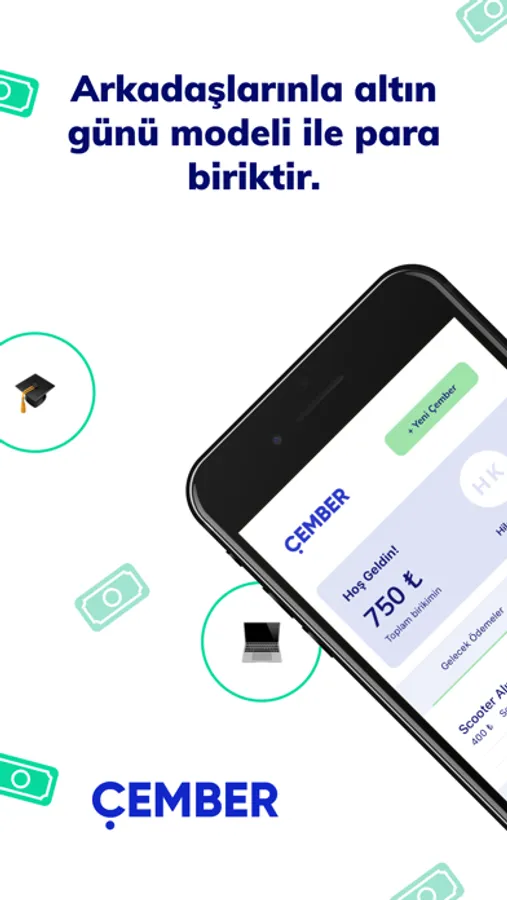 Çember altın günü modeli ile çalışan bir sosyal birikim uygulamasıdır. Tanıdığın ve güvendiğin arkadaşlarınla bir araya gelip istediğiniz hedefler için düzenli para biriktirebilmeni sağlar.