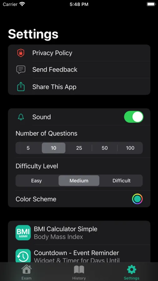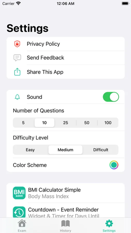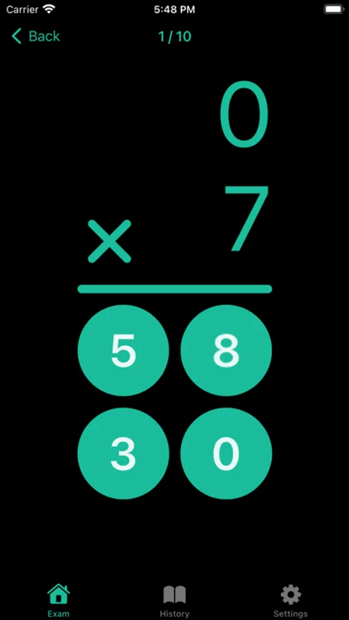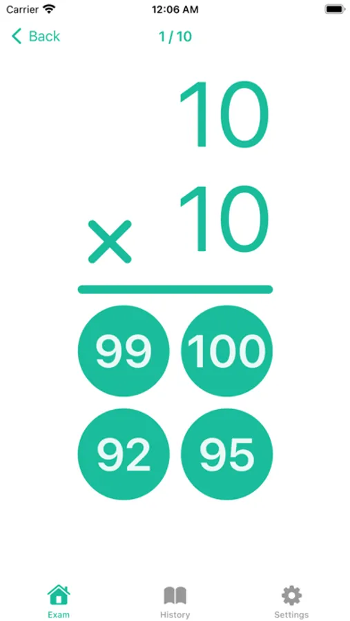 Features include addition, subtraction, multiplication and division. Set the number of questions in each quiz to five, ten, twentyfive, fifty or a hundred. Results of each test is saved to history for later review.