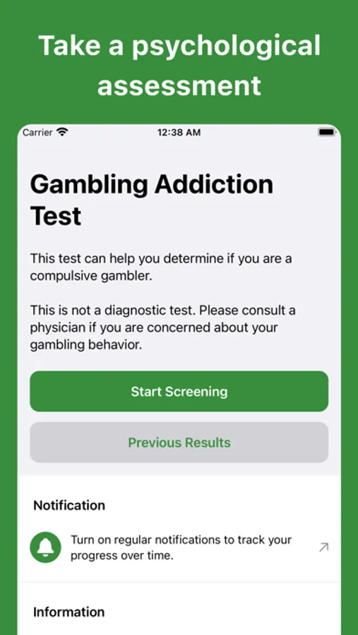 Disclaimer: This test is NOT a diagnostic test. A diagnosis can only be provided by a qualified healthcare professional. Please consult a physician if you are concerned about your risk of Gambling Addiction.