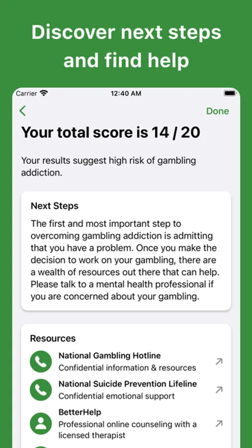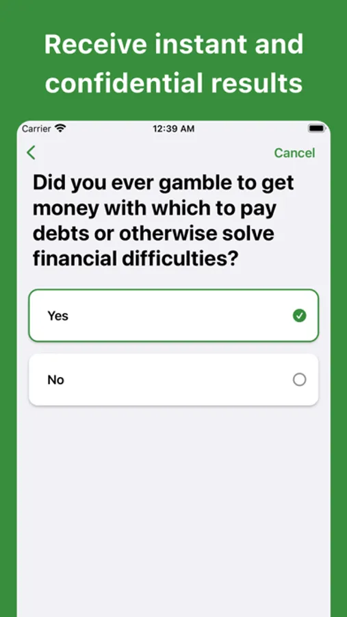 This app presents a simple screening questionnaire to measure your level of risk for gambling addiction as well as some information on the nature of addiction and different treatments.
