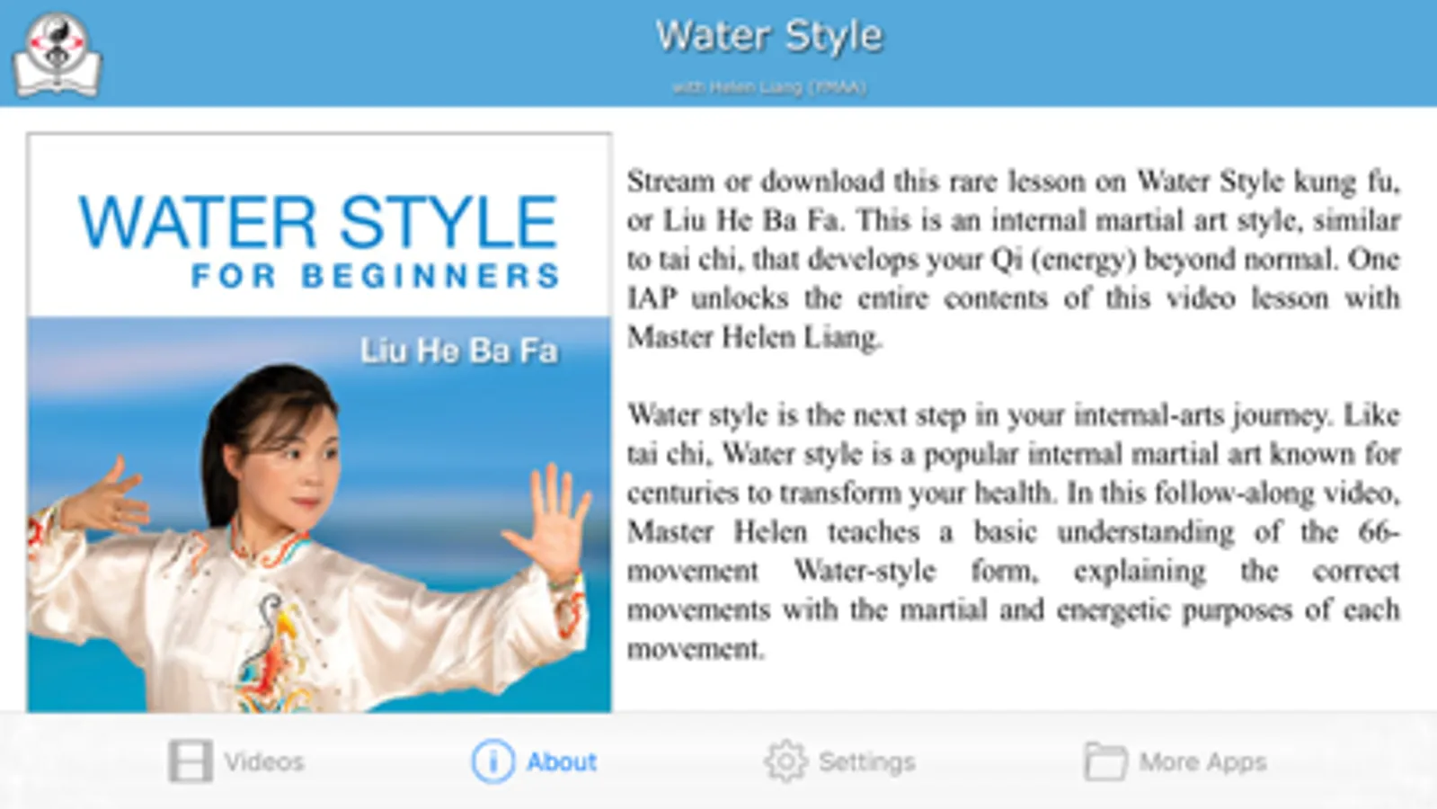 Stream or download this rare lesson on Water Style kung fu, or Liu He Ba Fa. This is an internal martial art style, similar to tai chi, that develops your Qi (energy) beyond normal. One IAP unlocks the entire contents of this video lesson with Master Helen Liang.