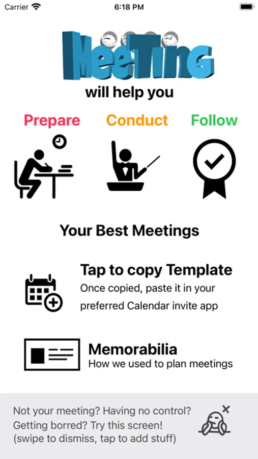 Better Meetings is an app which will help you prepare, conduct and follow up on your meetings. It will increase your productivity and those of your co-workers. This meetings best practices walk through will give you the correct reflexes to create, invite, conduct, animate productive meetings where everyone feels his time is valuable and best use. The application utilizes artificial intelligence to help you sense the constructiveness of your meetings.