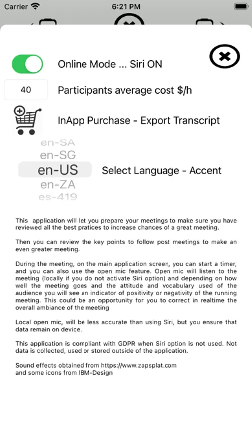 - Open the mic to give you a hint on the positiveness or negativeness of the meeting using Artificial Intelligence and Natural Language Processing (NLP). Not all hardware will support on device transcript, in that case the application will propose you to use the Siri cloud services.