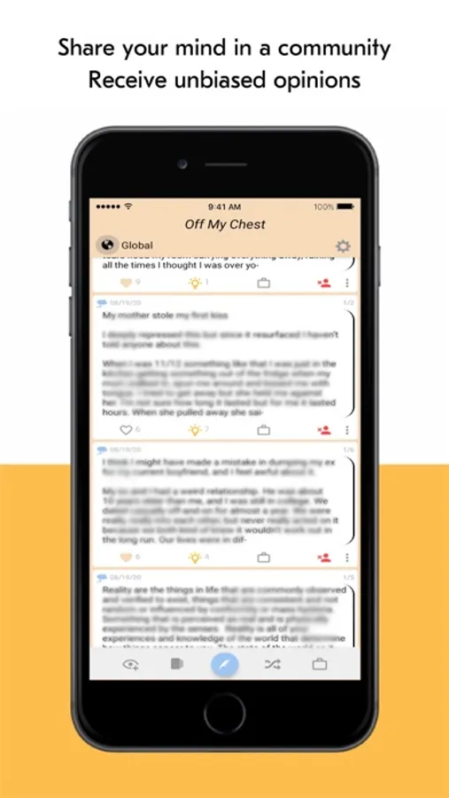 With Off My Chest, you are given the opportunity to free your mind and receive honest opinions not based on irrelevant details, but rather based on the mindset of the person responding.