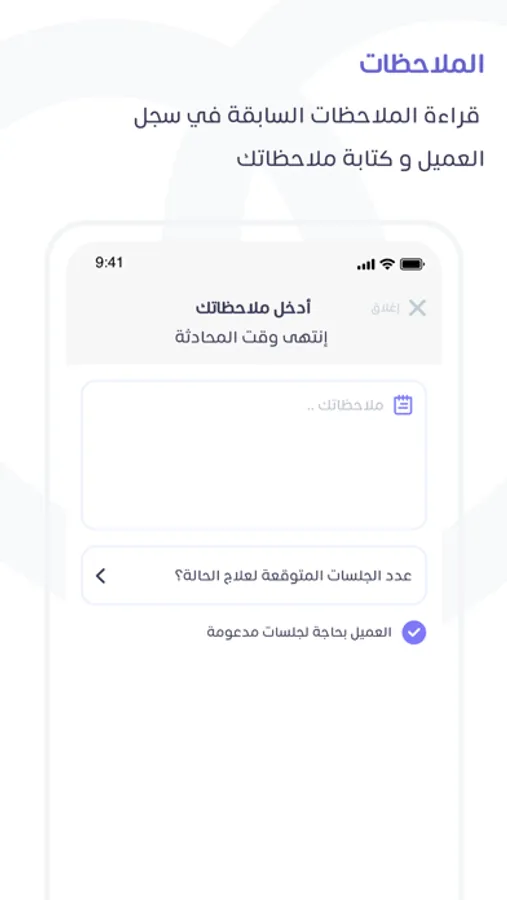 - نظام ملاحظات عن كل جلسة وملخص عن العميل وحالته.