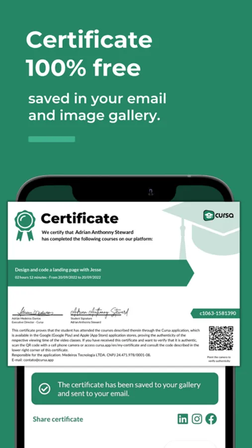 It is possible to issue a Valid Certificate, which is saved to your image gallery and also sent to your email upon completion of the free course.