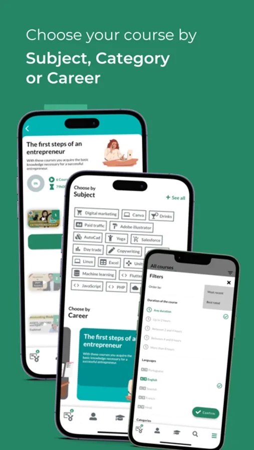 All these courses you can choose by categories, featured courses, best courses, by careers, by subject, by teacher or search by name.