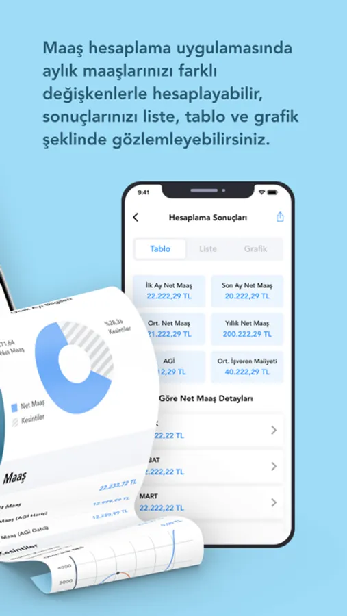 Maaş Hesaplama uygulamasında aylık maaşlarınızı farklı değişkenlerle hesaplayabilir, sonuçlarınızı liste, tablo ve grafik şeklinde gözlemleyebilirsiniz.