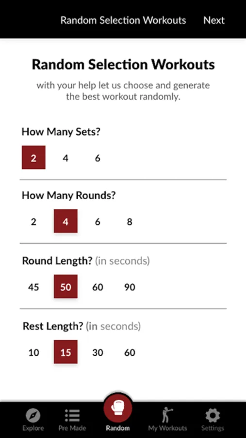 The randomizer is the key component of this app, which gives the option of selecting the sets, how many rounds per set, the length per round and recovery, type of activity per set, and the difficulty level. Once your preferrable options are selected, you then hit the “Random” button and your workout is created.