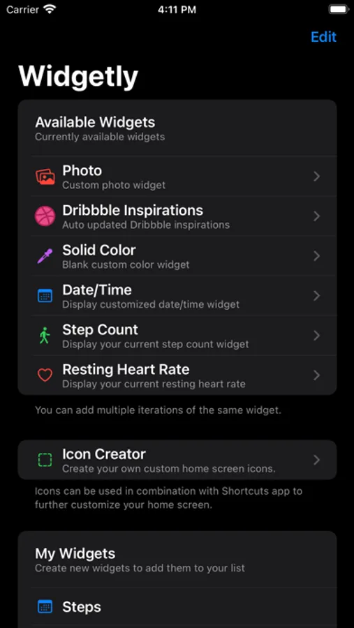 Starting with this version of the app you can create your own custom icons for the apps. Giving you unlimited possibilities of theming your iOS 14 Home Screen. Use these icons in combination with the Shortcuts app to give your iPhone and iPad a unique look. In addition to that, the app now integrates with HealthKit to bring the new step counting widget, and resting heart rate widget for you to configure and display on your Home Screen. These new widgets require you to grant Widgetly the ability to read your HealthKit data. Specifically, Step Count data and Resting Heart Rate Data. Widgetly reads this data periodically on your device and displays your step count on your new home screen widget. We have also added a brand new Dribbble widget that lets you display the latest inspirations from Dribbble right on your Home Screen.