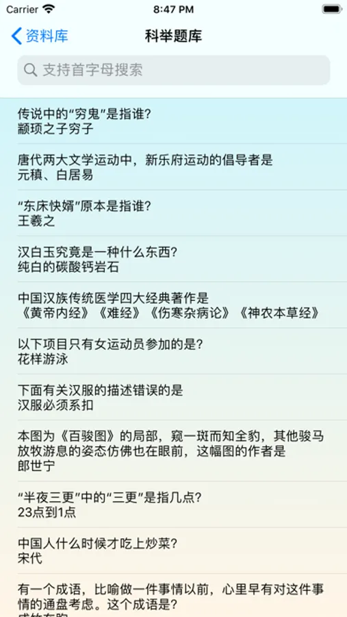 答题器支持首字母搜索,不用输入汉字,比其它的答题器快得多!