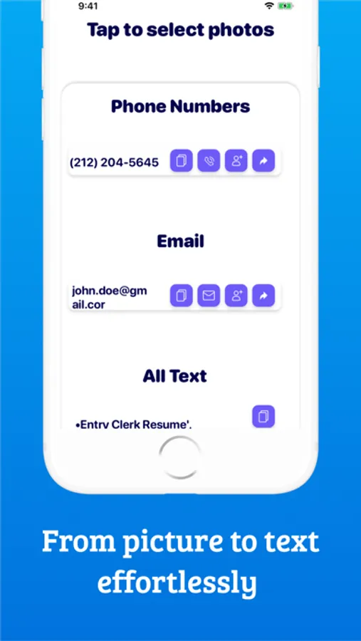 " Ultimate ocr - Picture To Text " effortlessly scans and extracts text from an image using the power of artificial intelligence. With in a few clicks go from image to text and have your text organized in subcategories (phone number, email , address etc )Ultimate ocr is an easy to use powerful text recognition app.