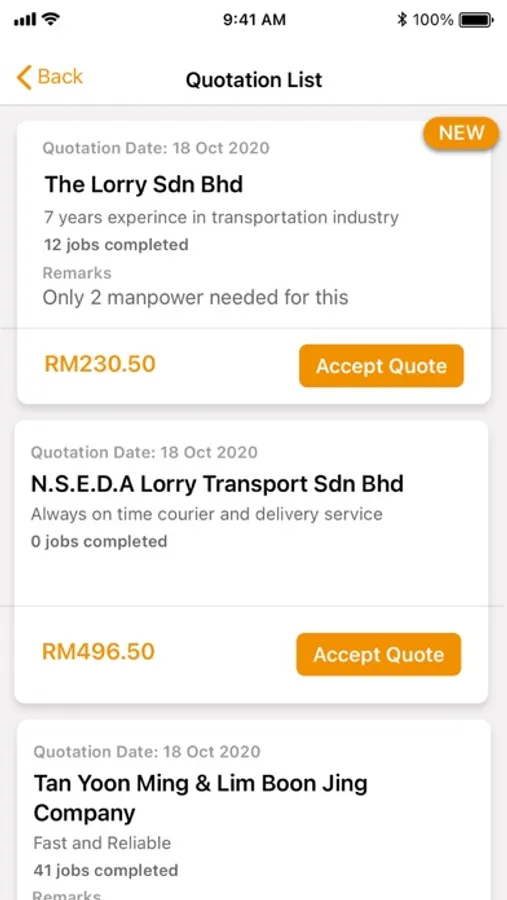 • Quotation direct from the transporter via push notification