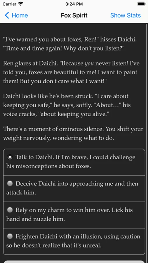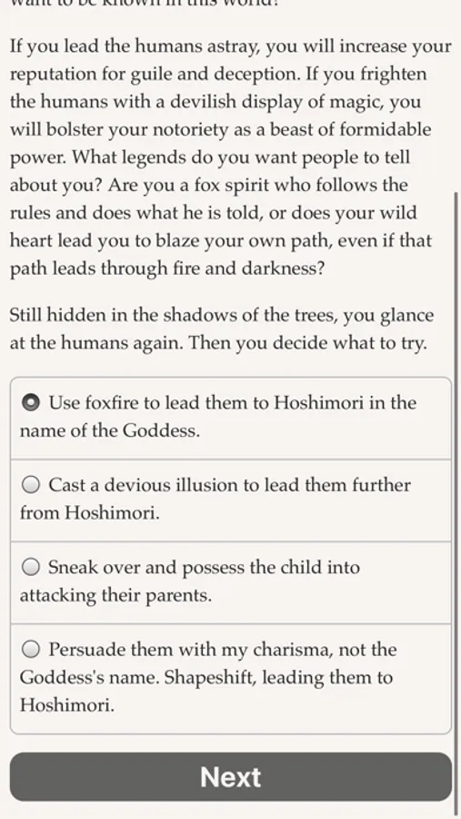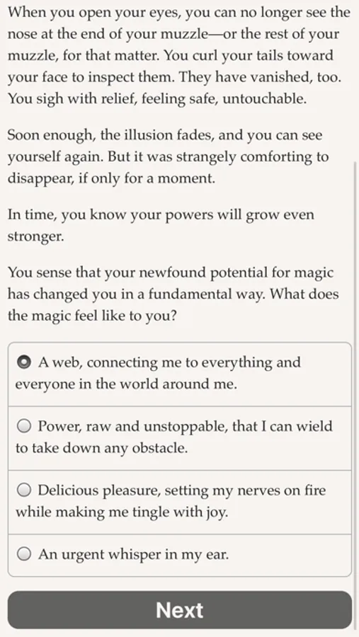 "Fox Spirit: A Two-Tailed Adventure" is a 250,000-word interactive fantasy novel by Amy Clare Fontaine, where your choices control the story. It's entirely text-based, without graphics or sound effects, and fueled by the vast, unstoppable power of your imagination.