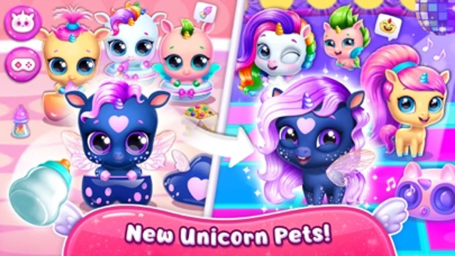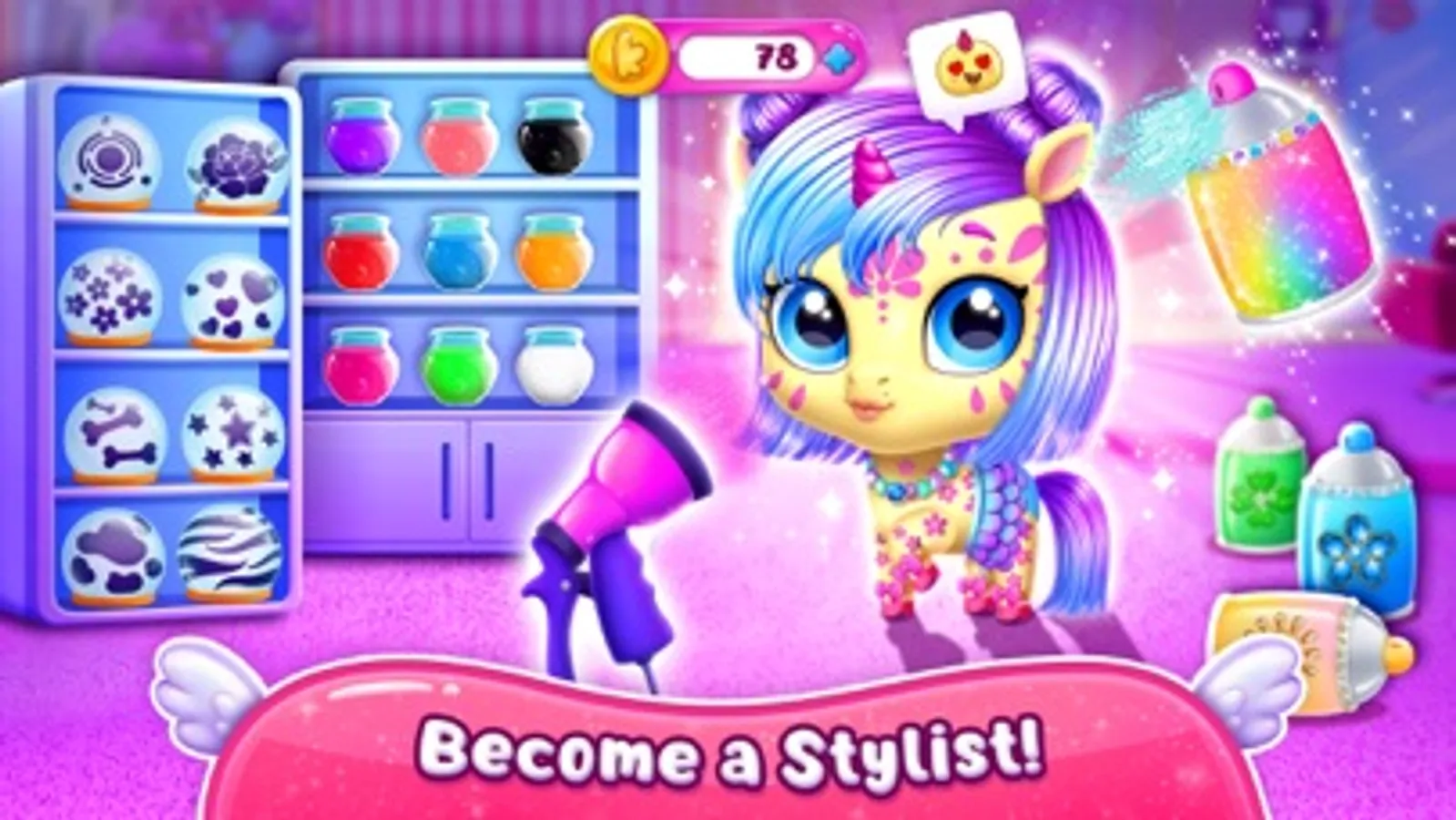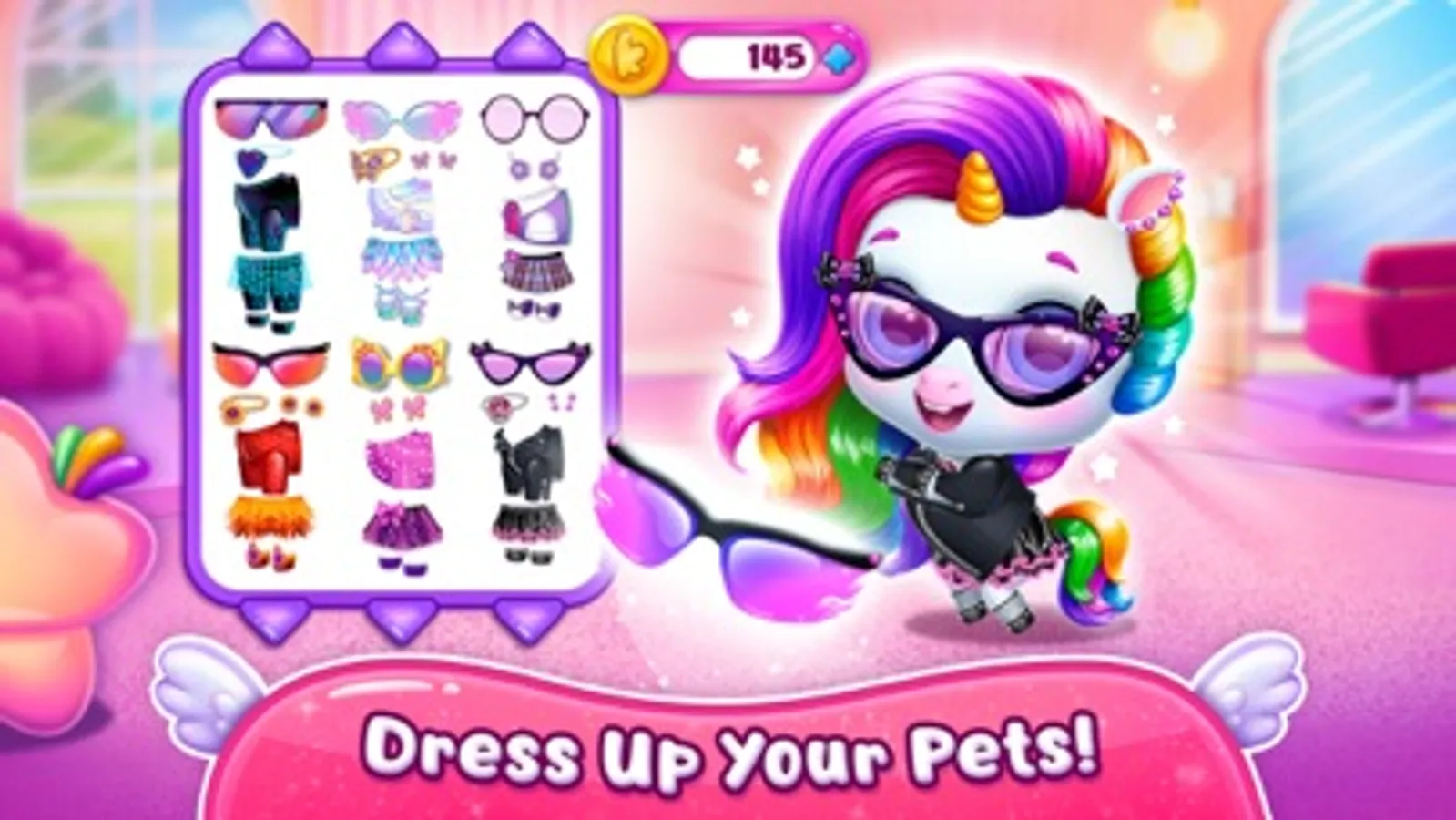 Think a unicorn is cute? Make it even cuter! Choose a pet to dress up, change the eye color and shape, and pick accessories. Express your style with cool glasses, sparkly earrings, adorable hoofs, cute collars, and more! Stylish!