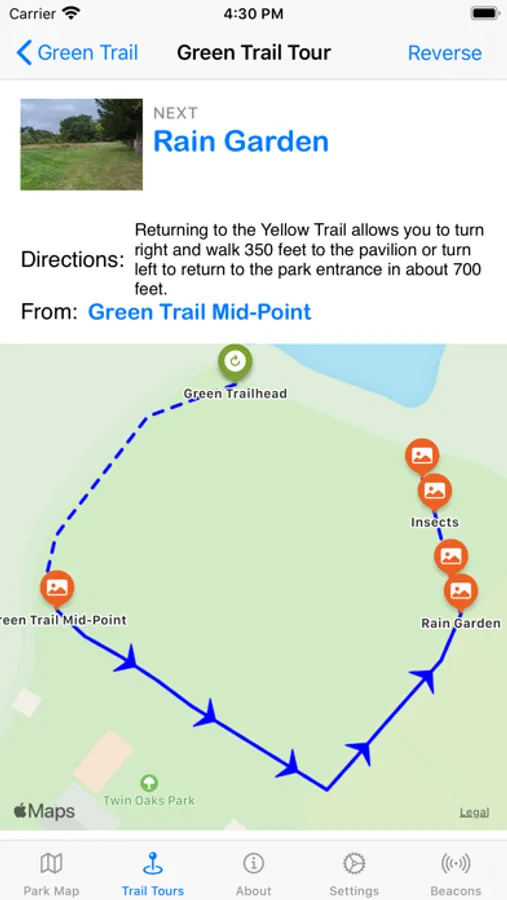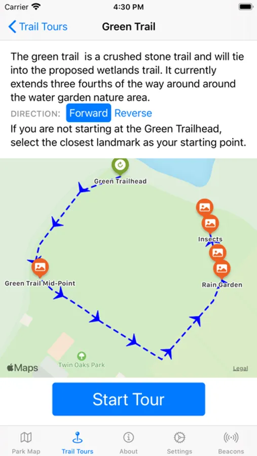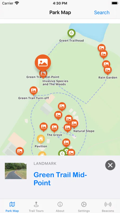 The main park map lets you inspect the points of interest in the park and notifies you as you approach one. Trail tours offer a more guided experience, describing the trails through the park as you walk them.