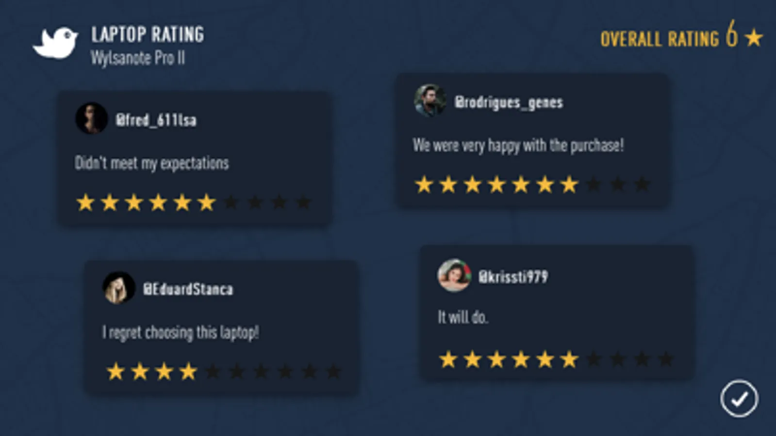 Something is happening that no one expected, not even you! Excellent rating, the laptop is taken apart on the shelves in stores and the whole world is talking about your company. The competitors are furious and bewildered, but that's what we wanted.