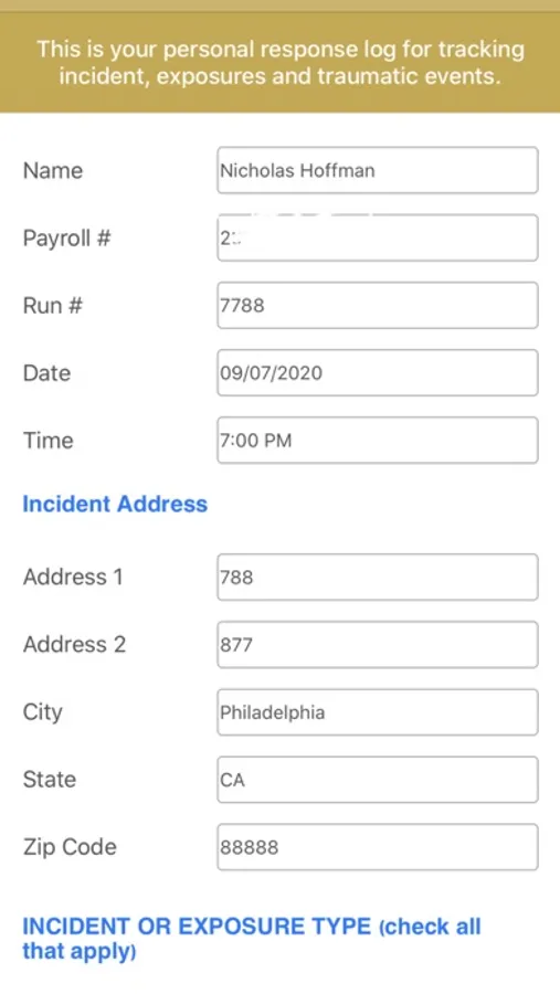 Application is for fire fighter, paramedic or officer who can access and use the exposure tracker which serves as a personal database providing a detailed history of work and exposures in a private, encrypted and secure online environment.