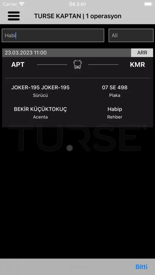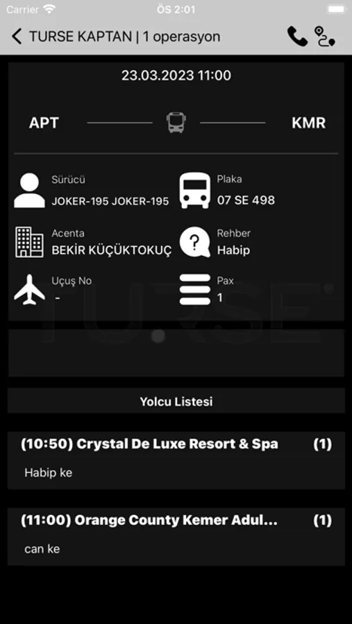 Uygulamaya giriş yaptıktan sonra transferinizi gerçekleştiren aracımızın, sizlere yardımcı olan şöförümüzün, gideceğimiz rotanın, yolcu listesinin ve uğrayacağınız otellerin bilgilerine kolayca ulaşabilirsiniz.