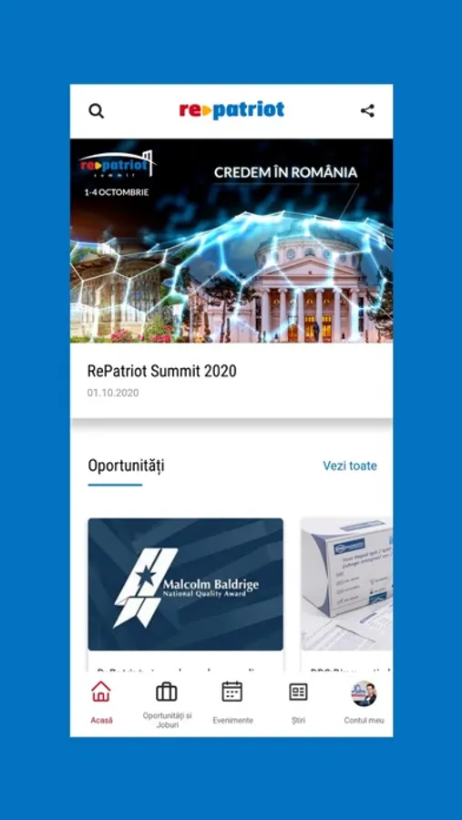 Aplicația RePatriot este locul în care te poți conecta cu români din toată lumea și poți să fii la curent cu oportunitățile pe care aceștia le oferă. Dacă îți dorești să dezvolți o afacere, să îți găsești un loc de muncă în România, să-ți extinzi afacerea clădită cu multă muncă, singur sau prin intermediul parteneriatelor cu românii din diaspora, să vezi evenimentele românilor sau să afli cele mai recente știri din diaspora și din România, atunci Aplicația RePatriot este pentru tine.