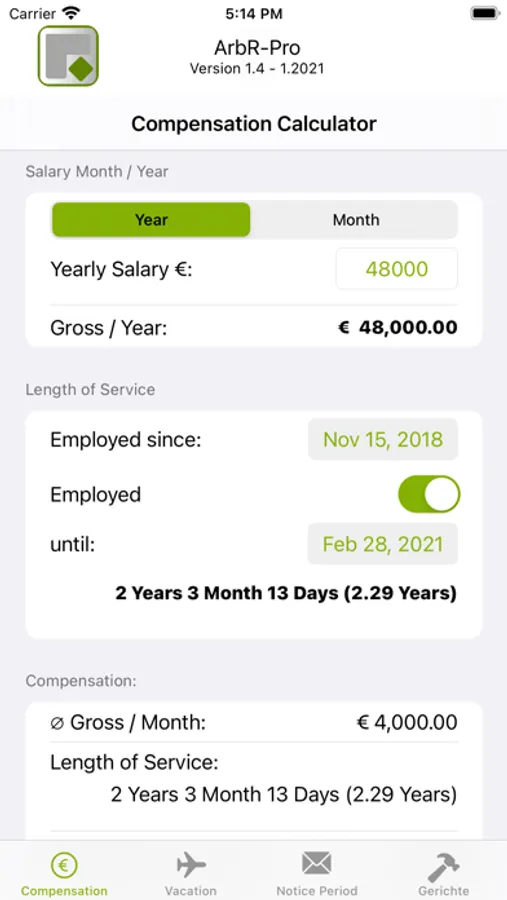 For labor law claims to severance pay and vacation compensation, ArbR-Pro determines the specific amounts on the basis of salary data and periods according to german labour law.