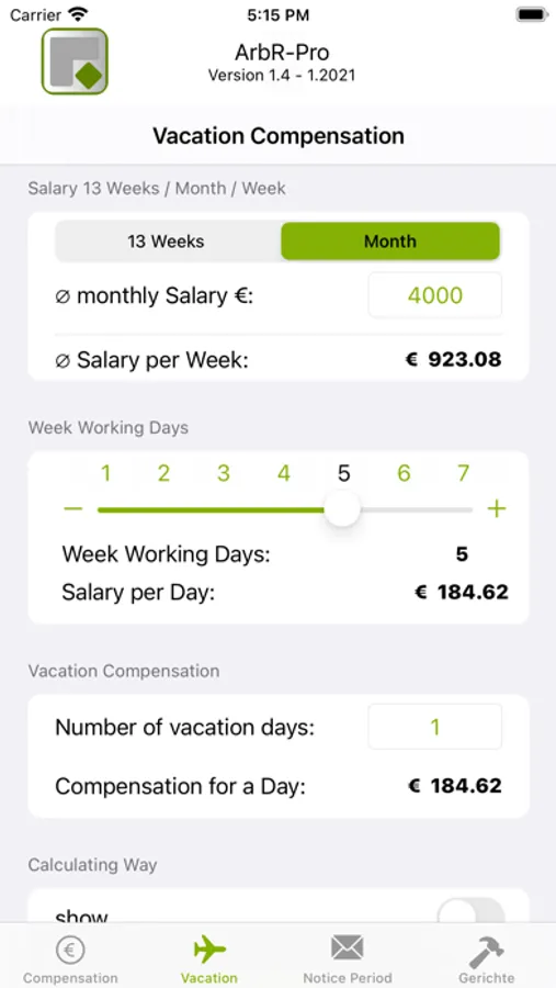 In the event of termination without notice or revocable leave of absence, remaining vacation entitlements may arise which must be paid off. Compensation claims are based on the average salary of the last 13 weeks (or last quarter). The average earnings per week result in the value of a vacation day depending on the number of weekly working days. The calculation result can be broken down and displayed and exported.