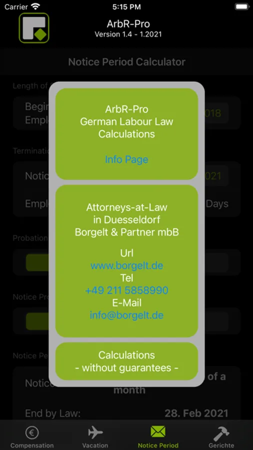 The calculation of notice periods may make it necessary to take into account conflicting provisions from the contract and the law plus probationary periods. By entering the date of the start of employment and the received (or expected) termination, the app calculates the legal and, if applicable, contractual deadlines.
