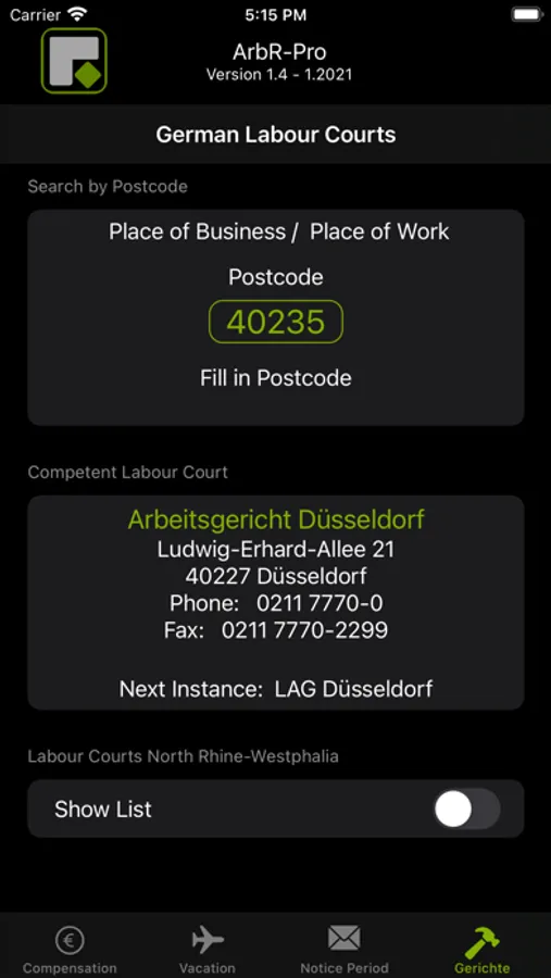 The local jurisdiction of the labor court in Germay depends on the place of work or the seat / place of residence of the respondent. ArbR-Pro determine the competent labor court and the appellate courts by postcode and contains the contact details of all labor courts in Germany.