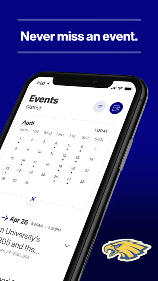 The event section shows a list of events throughout the district. Users can add an event to their calendar to share the event with friends and family with one tap.