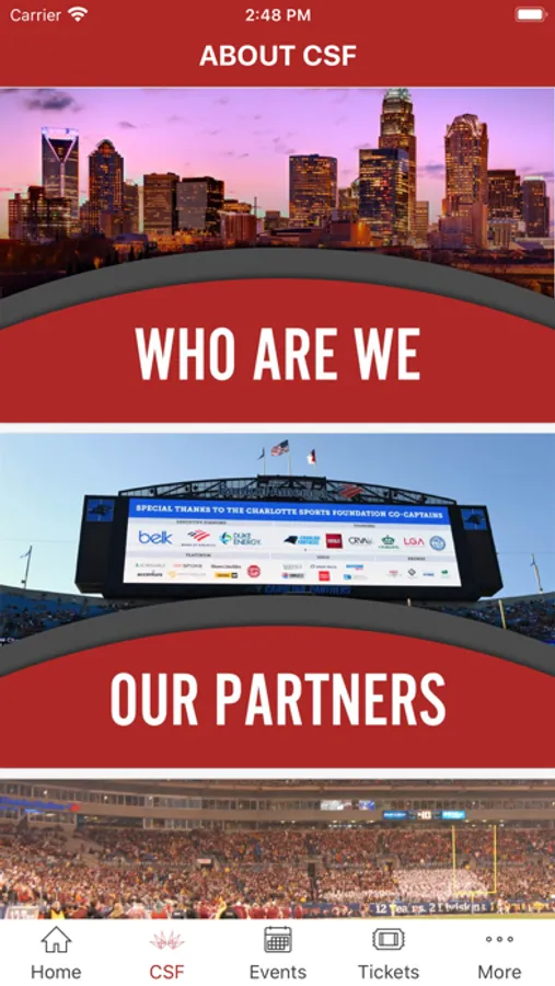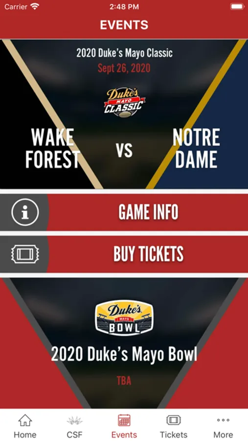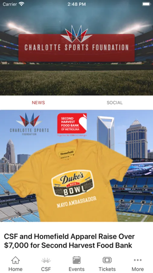 Stay up-to-date and involved with the Charlotte Sports Foundation through the CSF Official Mobile App. Access your account to manage and view your paperless tickets, view event information, stadium policies, and get the latest news and information conveniently on your mobile device. Featured events include the Duke’s Mayo Classic and the Duke’s Mayo Bowl.