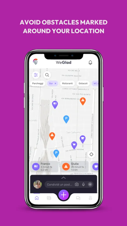 The app for safe and personalized mobility, starting from people with disabilities. WeGlad allows you to report obstacles in real time and find routes without architectural barriers. The aim is to make travel more secure and to strengthen the connection between the person with disability and the accessible place.