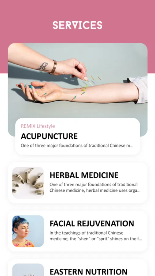 Experience the healing power, and modern medical magic of REMIX’s acupuncture and herbalism practice, along with its complementary, botanical-based beauty and aromatherapy line, all with a download of this app.