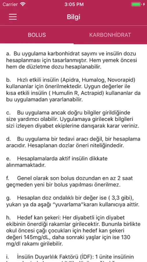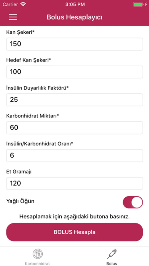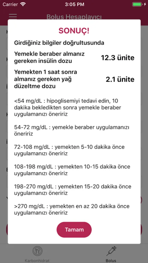 • Bolus hesaplayıcı kısmında kan şekerinize, insülin duyarlılık faktörünüze, insülin karbonhidrat oranınıza ve aldığınız karbonhidrat miktarına göre öğününüz için gerekli bolus insülin dozunuzu hesaplayabilirsiniz.