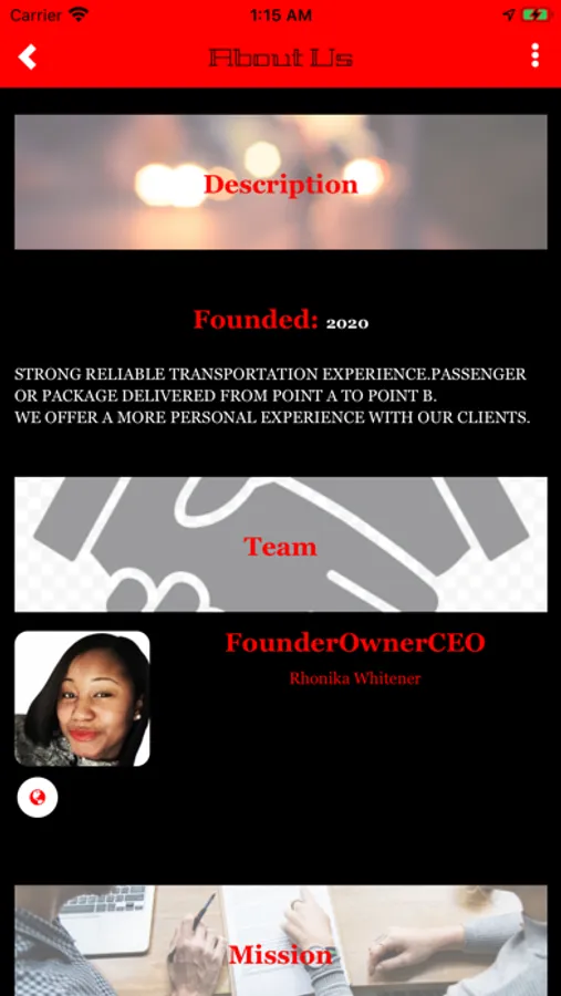 Providing Transportation Services For Packages, Passengers, & Small Businesses. Medicine, Documents, Boxes, Small Appliances, Small Furniture, Grocery Under 20 Items, Electronics, Person To Person/ House To House, Personal Items, Appointment Only Rides. This App Has Many Features Outside Of The Transportation Field. Its A Must Have.