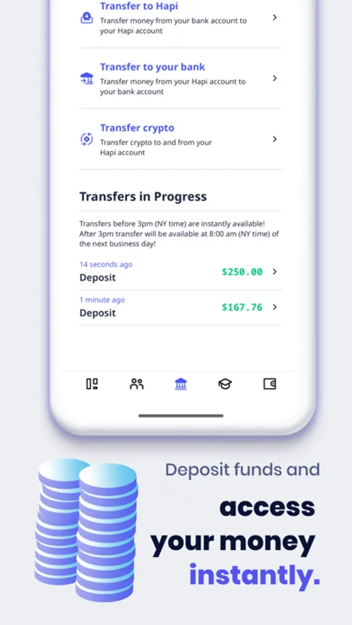 Hapi is the first investment app in Latin America where you can invest in stocks of the US Stock Exchange, ETFs and cryptocurrencies in the same portfolio. Now you can also enter funds directly from the app, at a lower cost and use them immediately. There is no minimum amount to start investing, with US$1 you can invest in fractional shares or cryptocurrencies.