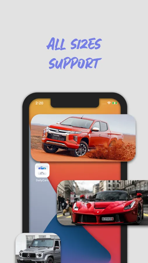 DailyCars is the first widget that conjures up a new random car on your homescreen every few minutes. Almost well over 100 cars of different brands and models are represented. Let yourself be surprised by a new car brand and model every day and play along. Select your preferred size from all available widget sizes and simply put it on the home screen. Let's see how many cars you can guess every day.