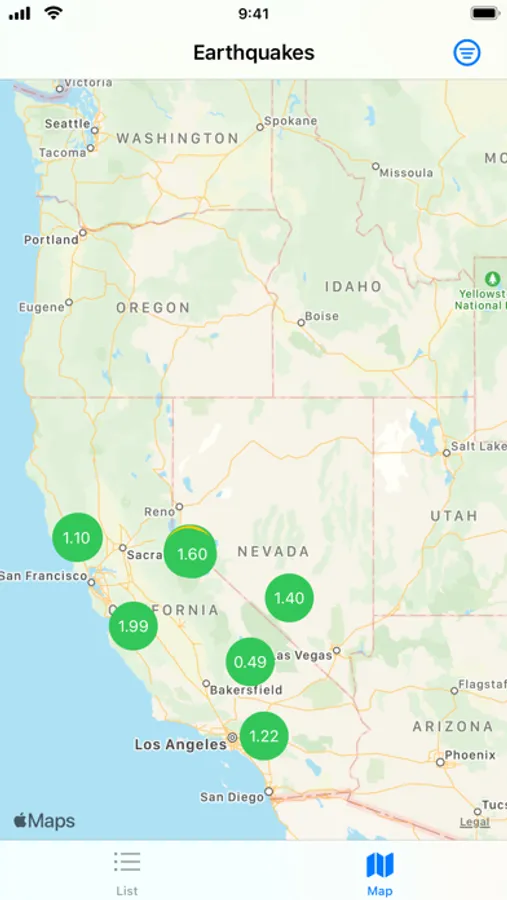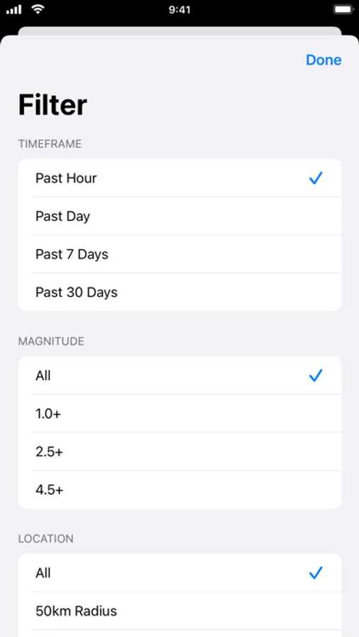 This app displays recent Earthquakes, and allows the user to filter by timeframe, magnitude, and relative location of the events.