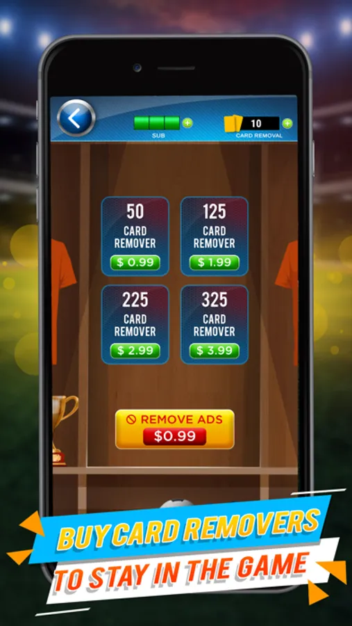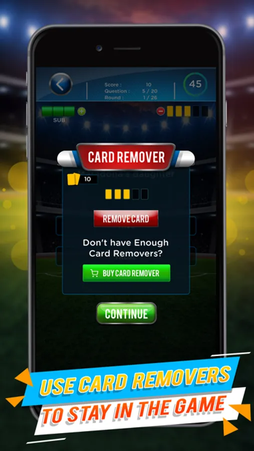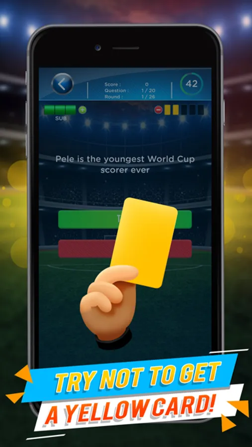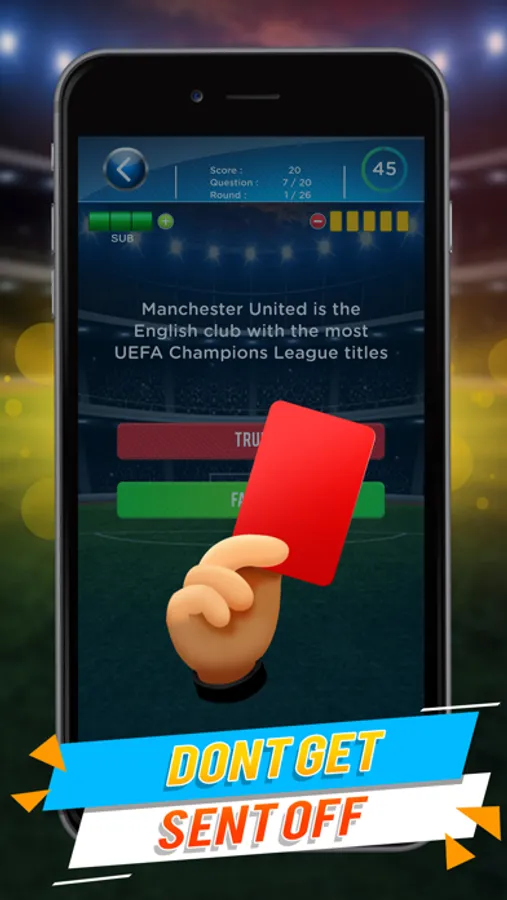 This soccer quiz immerses you in the full soccer experience. The rules are as follows. You are allowed 3 substitutions in every round, just like in a real soccer game. The substitutions allow you to skip a question. If you get an answer wrong, you will get a yellow card. If you accumulate five yellow cards you will get a red card and you will get sent off. You will then be suspended . You either need to wait for 90 seconds to play again, or you can watch a video to play immediately. At the start of the game, you receive 11 card removers and 3 substitutions. You need to achieve a score of 14/20 to pass a round. If you score 13 or less, you will fail the round and you will have to replay it. You can refill your substitutions by watching a video. You can purchase more card removers in the locker room. You can check your progress under your profile section.