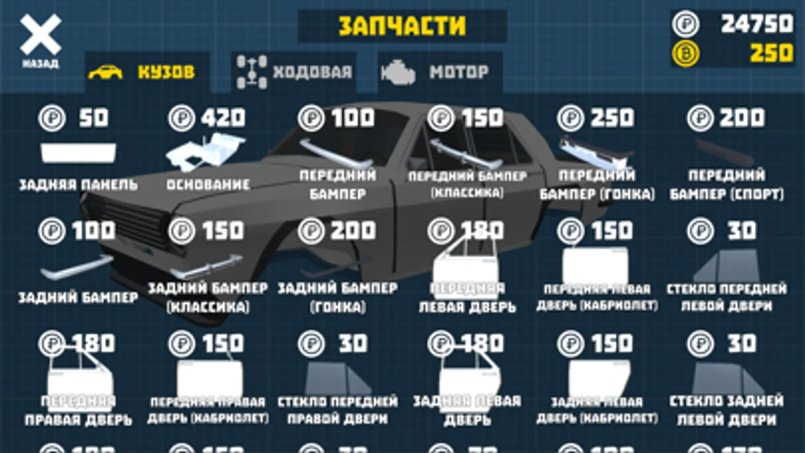- Each car consists of more than 50 parts in 3 categories: body, chassis and engine. If you wish, you can make tuning and replace part of the body and suspension parts with sports, racing and other modifications!