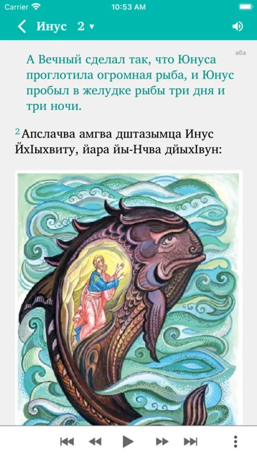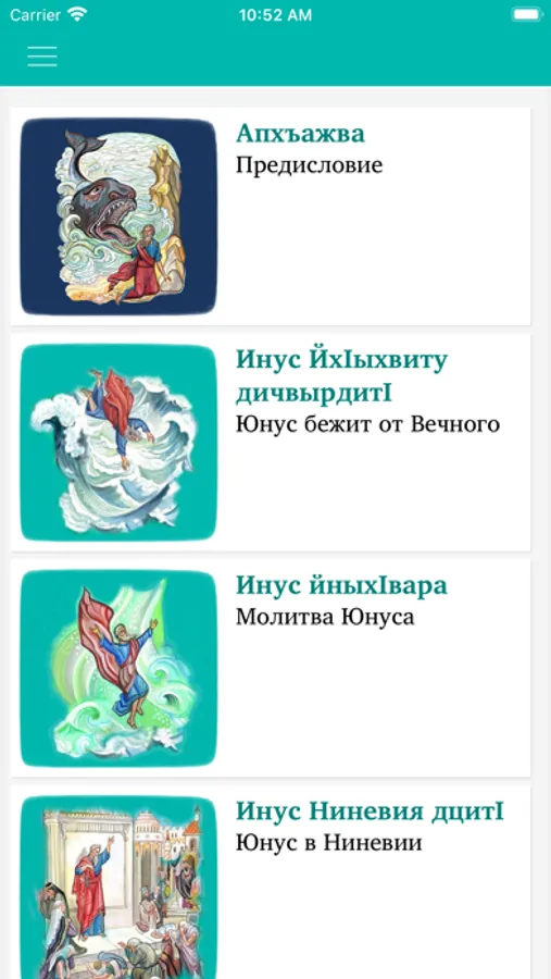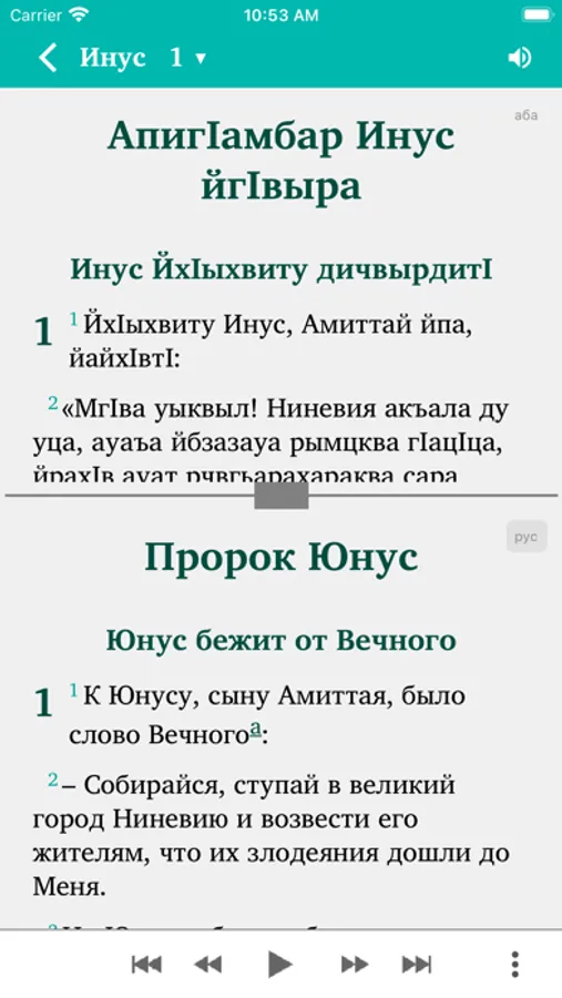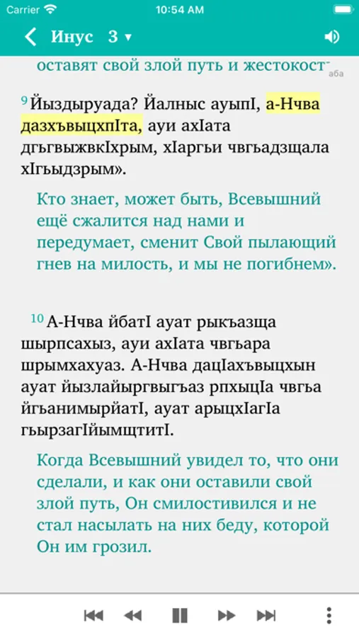 This Scripture Jonah app facilitates Bible study in the Abaza language. The Russian translation (NRT) can optionally be added in parallel to the Abaza text. Users can highlight verses in different colors, make bookmarks, write notes and view their reading history.
