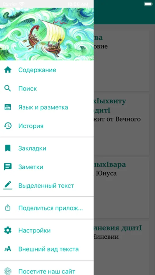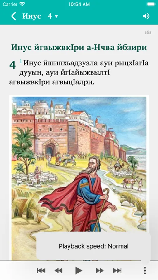 The app includes audio that has been synchronized with the Abaza text (each verse of text is highlighted when the corresponding audio fragment is played, if this option is not turned off in the app's settings). An Internet connection is needed for streaming listening or for the first download of each audio file to the smartphone's internal memory, with subsequent offline listening.