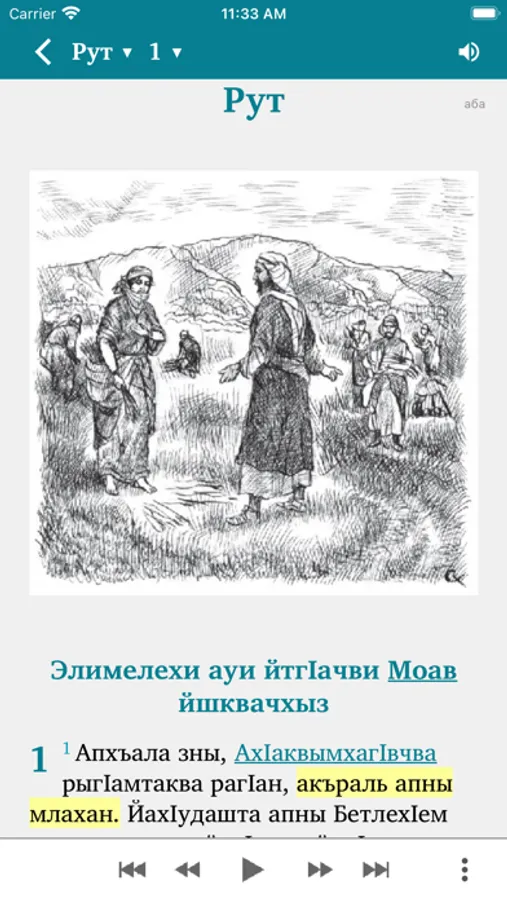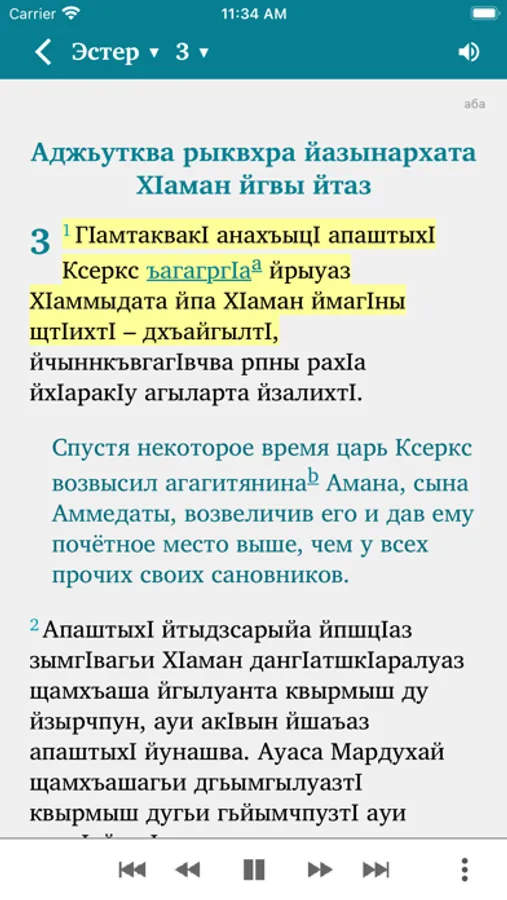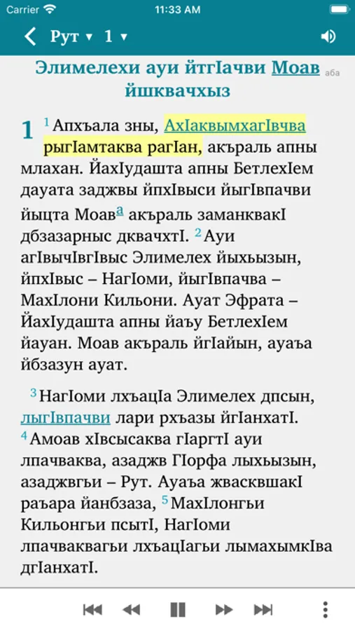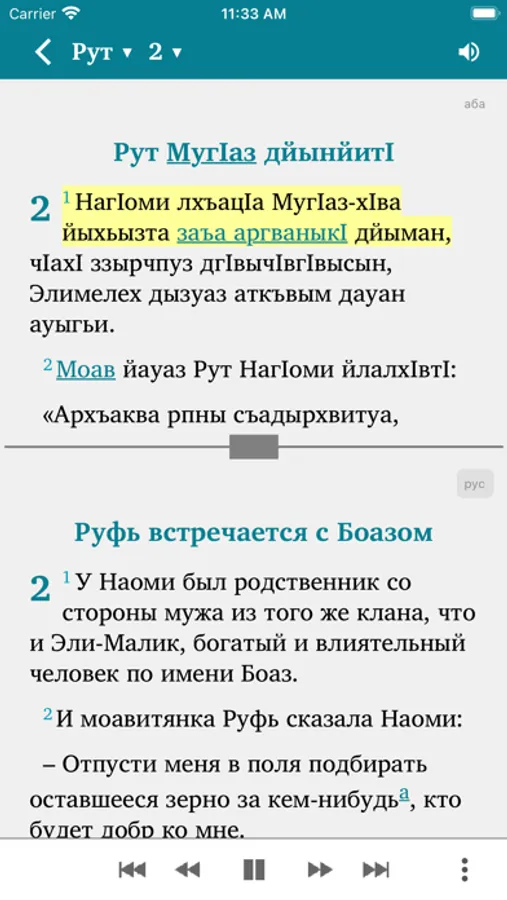 This Scripture app facilitates Bible study in the Abaza language. The Russian translation (NRT) can optionally be added in parallel to the Abaza text. Users can highlight verses in different colors, make bookmarks, write notes and view their reading history.