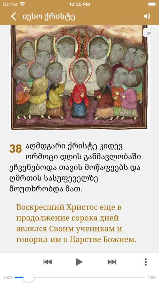 The illustrated app “Stories about Jesus Christ” is a collection of retold Bible stories and direct quotations from the Bible in three languages: Georgian, Russian and English. In 2002, they were translated into Georgian by Roin Kondzhariy and published with illustrations by David Popiashvili. The English translation was made by Anna-Lena Hansson. In our app it is possible not only to enjoy the pictures and read the text, but you can also listen to text in the different languages. The app includes streaming audio. Audio files may also be downloaded to the smartphone's internal memory, with subsequent offline listening. An Internet connection is needed for the first download of each audio file. Users can highlight verses in different colors, make bookmarks, write notes and view their reading history.