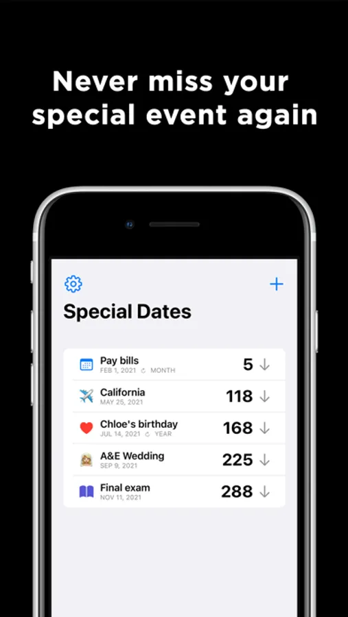 Simplest app to save dates and see a countdown of each one. Allows to save periodically events like birthday or bills.