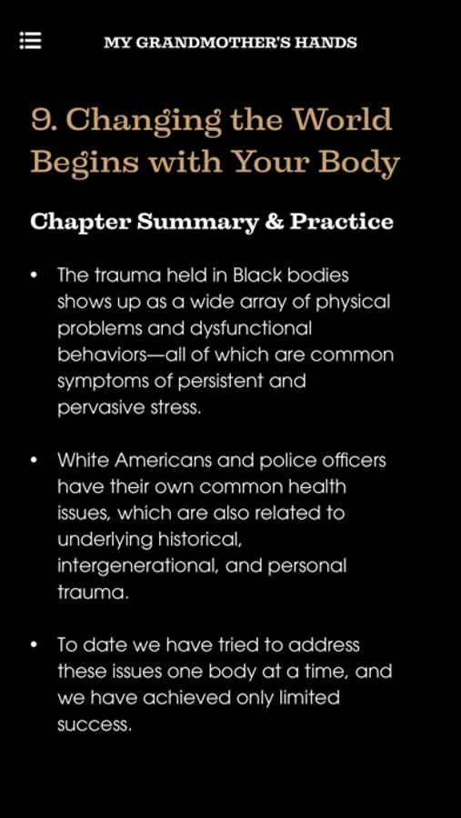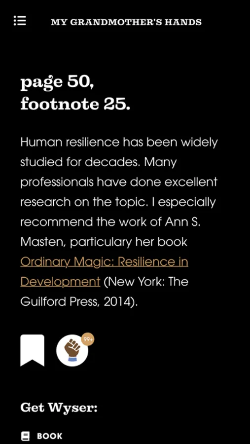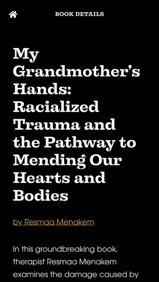 Once you start reading your books with the WYSER companion experience, you’ll wonder how you ever managed reading without it. The first book on the platform, My Grandmothers Hands, examines the damage caused by racism in America from the perspective of trauma and body-centered psychology. My Grandmother's Hands’ WYSER content also includes study guides and interactive practices, engaging the user with a step-by-step healing process based on the latest neuroscience and somatic healing methods.